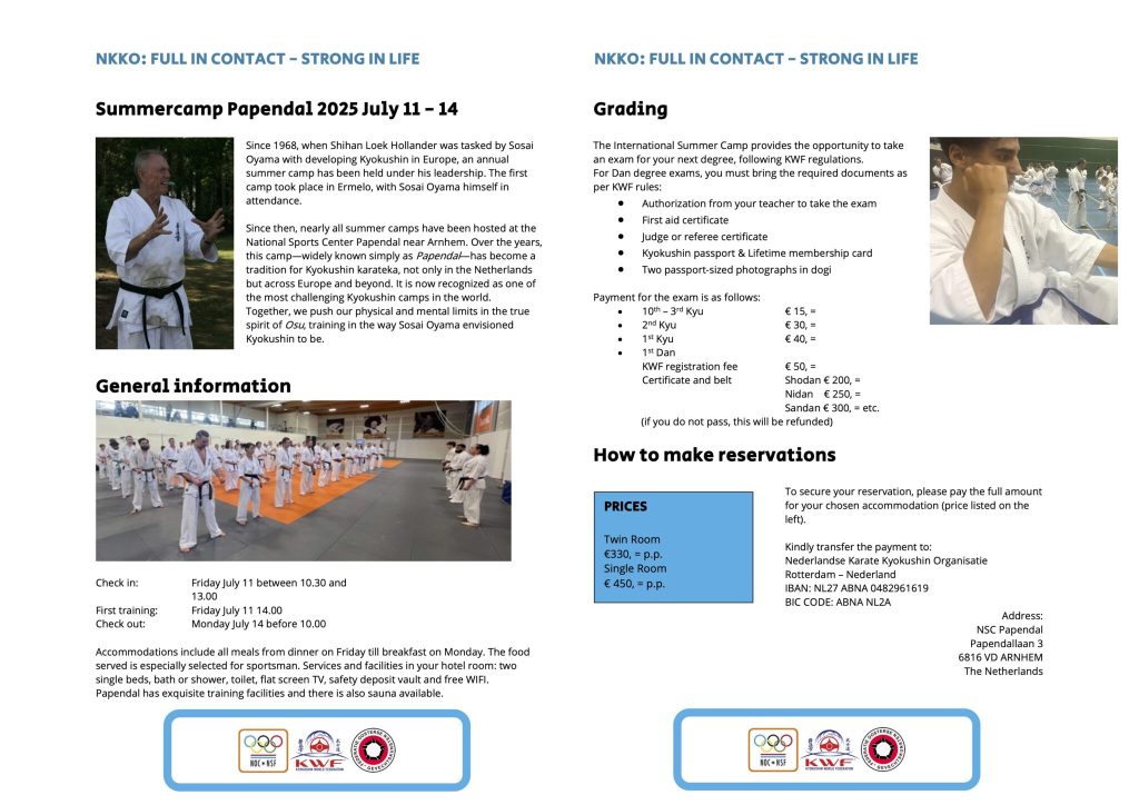 Iedere zes maanden kun je examen doen en laten zien wat je hebt geleerd. Ook organiseren we elk jaar de NKKO Summerschool: een superleuke kans om nóg beter te worden. Wil je extra trainen? Sluit dan aan op de eerste zondag van de maand in Papendal. Daar train je samen met anderen én ontmoet je misschien wel de karateka’s van het Nederlands team.